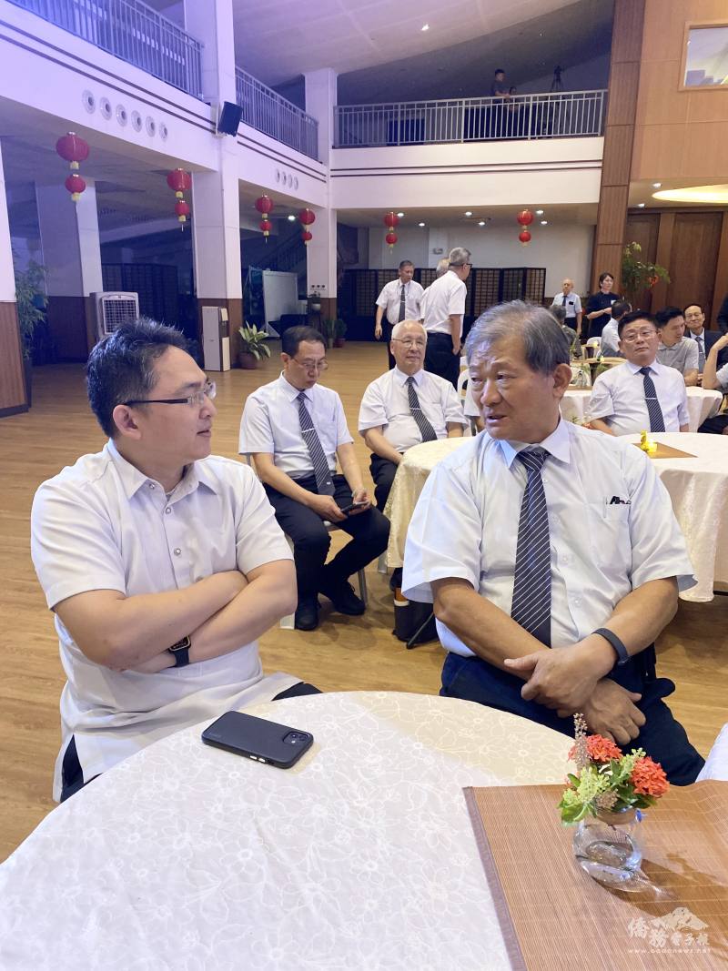 菲華文教服務中心主任莊博智(左)與菲律賓慈濟分會前副執行長合心關懷錢小進師兄互動