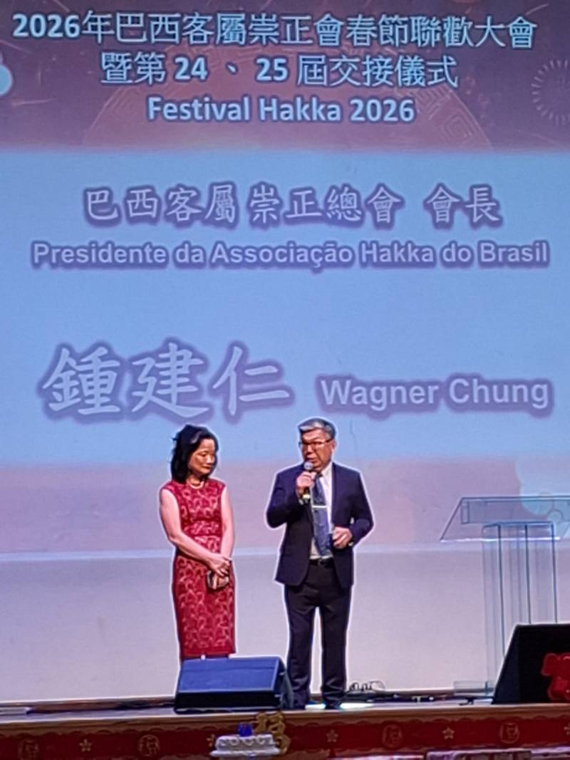 六年兩任的鍾建仁向鄉親們賀年,非常感謝駐聖保羅辦事處處長朱怡靜伉儷趕場前來。回顧六年前接下崇正會長一職,首先感謝所有名譽會長及理監事團隊們,共同把客家形象推進更上一層樓。今天主題「客家移民在巴西」,每一步腳跡都有故事,如:2020年疫情擴散非常嚴重,當時成立慈善小組,發揮女性的光輝,把慈善工作做得淋漓盡致;每年辦理我愛媽媽活動或慶祝父親節;兩週前發表客家軟實力,客家移民在巴西移民史發表會,亦感謝老師鄧幸光帶領的編輯小組,再次感謝歷屆會長及理監事們的支持。