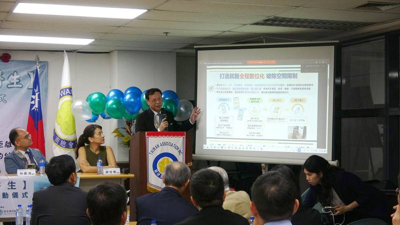 衛生福利部部長石崇良(站立者)27日至菲律賓台商總會會所,主持公益遠距醫療「看醫生」平台服務啟動儀式,說明遠距醫療優點。