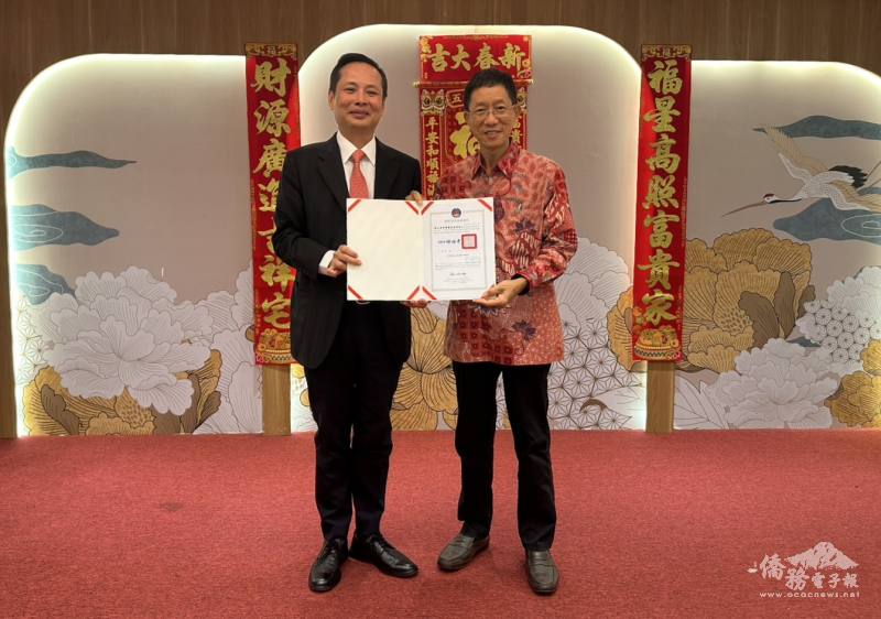 洪振榮代表僑委會頒發感謝狀予雅加達華僑慶典委員會譚自強主席,感謝其籌辦114年國慶活動的辛勞與貢獻。譚自強表示,國慶活動圓滿成功有賴各界支持,未來仍盼持續攜手合作,凝聚僑心。
