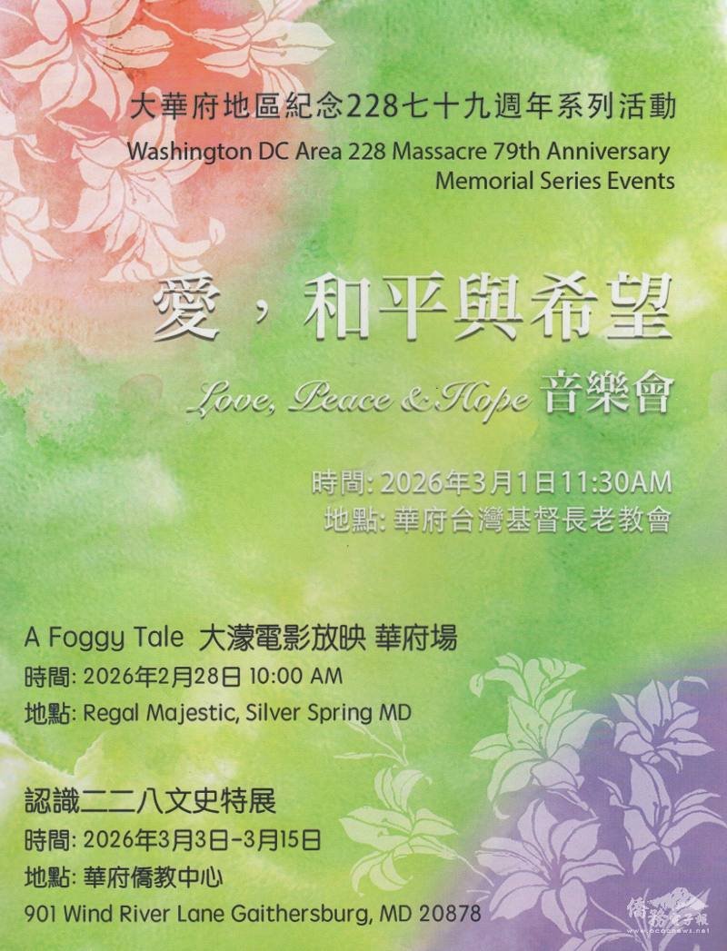 為紀念臺灣二二八事件79週年,華府地區僑界團體於2月28日及3月1日舉辦「華府地區二二八紀念系列活動」,透過紀念音樂會、歷史展覽及影像放映等多元形式,追思歷史記憶,深化社群對民主、人權與和平價值之認識與實踐。