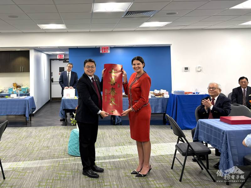周啟宇(左)致贈「七喜春來」春聯予Doral市議員Nicole Reinoso(右)