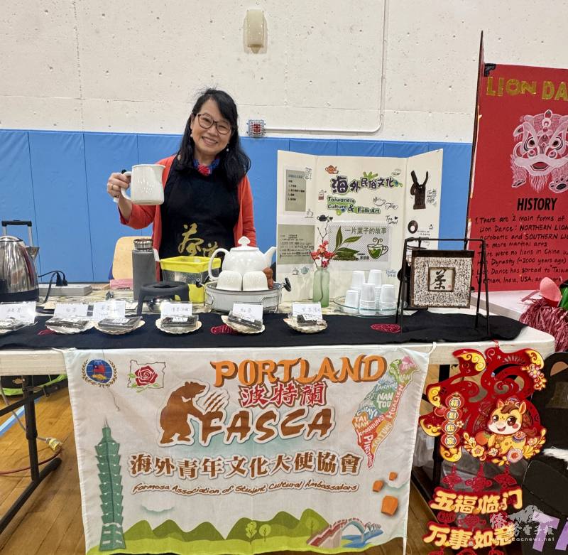 今年是FASCA波特蘭分會第二年參與盛會,學員們特別規劃兩個文化體驗攤位,一是由波特蘭學文化種子老師畢慧儀老師帶領的茶藝介紹,透過展示與現場解說,讓在地居民感受臺灣茶藝的精湛工藝與獨特的茶文化。另一攤位則以傳統農曆新年的歷史與文化為主題,詳盡介紹相關習俗之外,FASCA 學員也精心設計互動體驗遊戲,吸引眾多孩童踴躍參與。在地居民對臺灣文化有了更深入且具體的認識,該攤位也成為現場最受歡迎的展區之一。