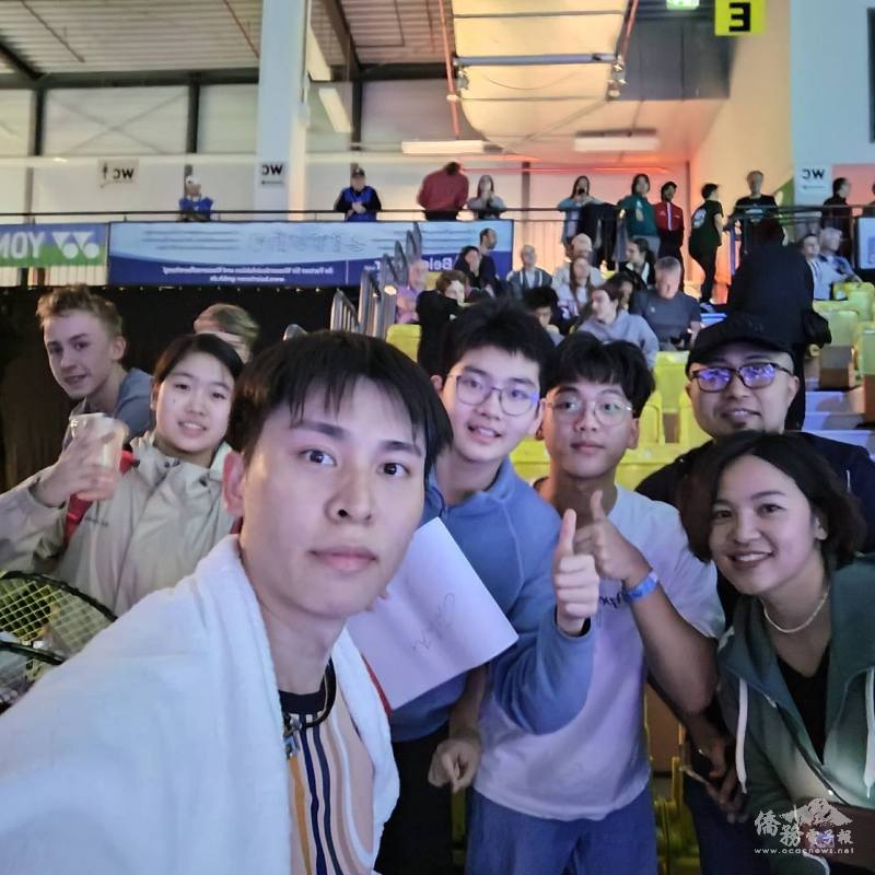 羽球選手林俊易微笑感謝僑胞們的熱情家加油一起合影