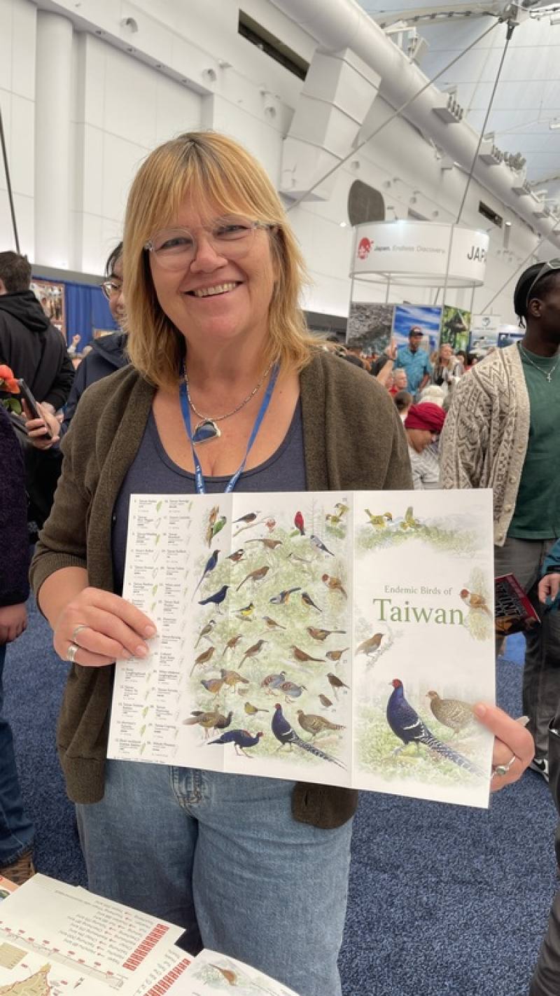 加拿大人Tina Komendat在台灣展場攤位上看到賞鳥的資訊及特有種鳥類別針掛布,大感驚喜。她對中央社說:「我一直是『熱血鳥友』,從來不知道台灣有如此多的獨特鳥種,現在我已經把台灣列在必遊清單上了。」