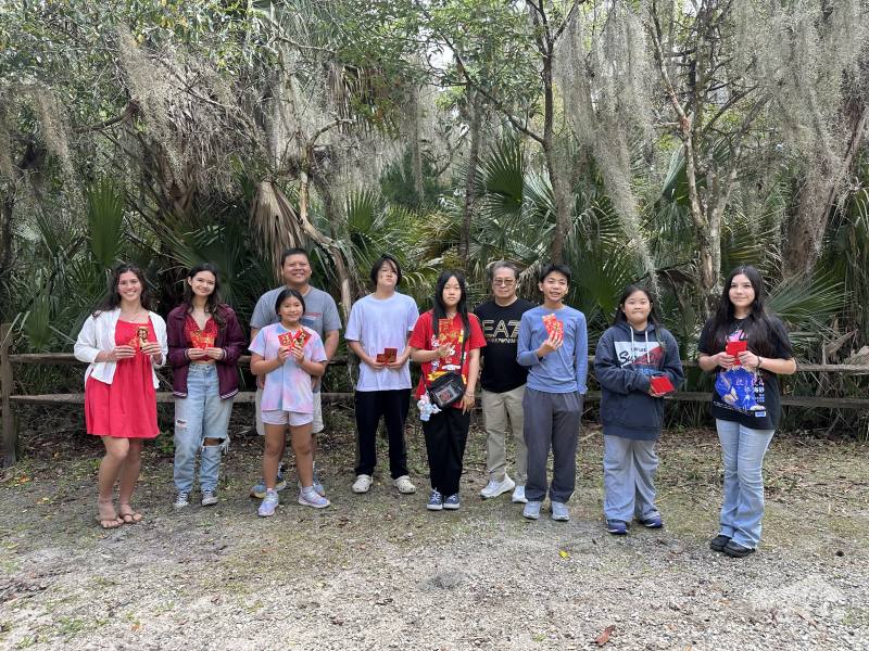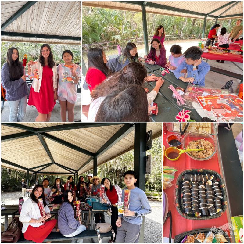 野餐會佈滿年味好菜,包含春捲、鍋貼、米糕、蘿蔔糕等,讓與會者在中佛州品嚐道地臺灣家鄉味。隨後「發紅包」環節,小朋友展現在中文學校學到的過年吉祥話,以華語和臺語向僑親拜年。現場也安排組裝僑委會贈送的燈籠、剪紙、折鐵絲絨花等手作活動。