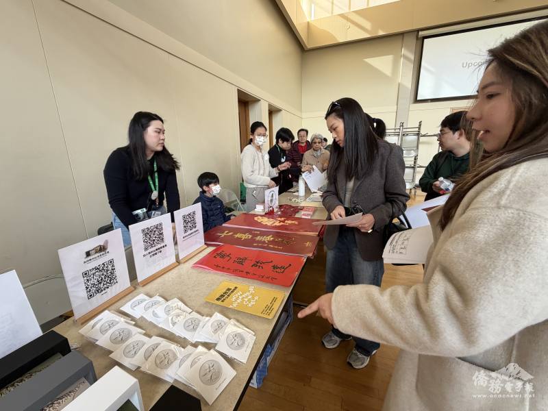 同鄉會提供228百合胸針及2026年「Team Taiwan」春聯,並與「台派寶寶」合作設計年會主視覺與主題貼紙給鄉親們領取