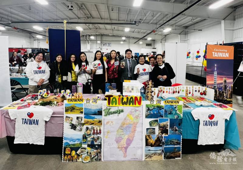 駐多倫多辦事處文化展攤僑委會國際青年親善大使候選人方姵臻(右二)於現場向主流人士推廣臺灣觀光