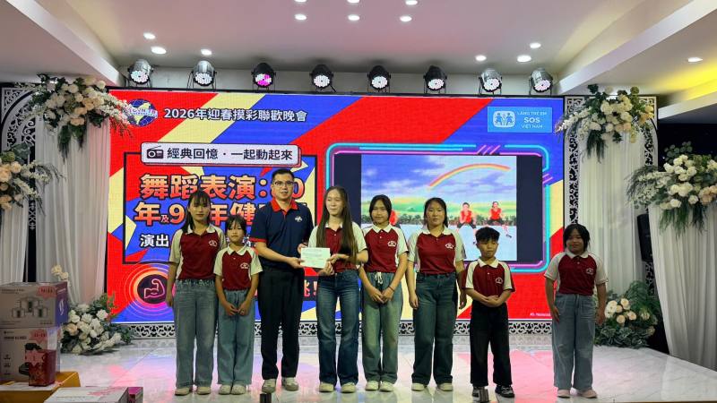越南臺灣商會聯合總會太平分會會長鄭閎元(左3)頒發資助金予SOS育幼院兒童