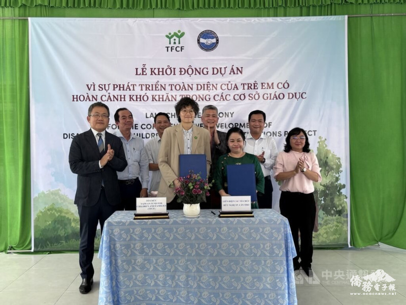 芹苴市越南友好組織主席黎氏成江(前右)與家扶基金會越南代表黃雅歌(前左)3月31日於新祿島上國小簽署合作備忘錄。駐越南代表劉世忠(後排左1)、胡志明市台商會長曾潮星(後排右3)等人見證。