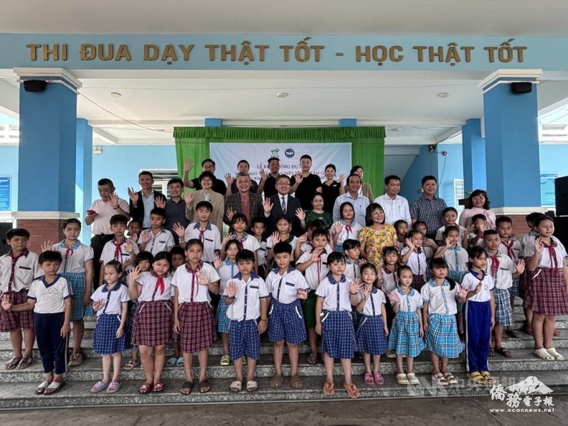 台灣家扶在有「台灣島」之稱的南越湄公河沙洲新祿島啟動「兒童教育發展方案」,3月31日計畫正式啟動,芹苴市越南友好組織主席黎氏成江(中右)與駐越南代表劉世忠(中左)贈送島上國小學童由胡志明市台灣商會捐贈的學用品。
