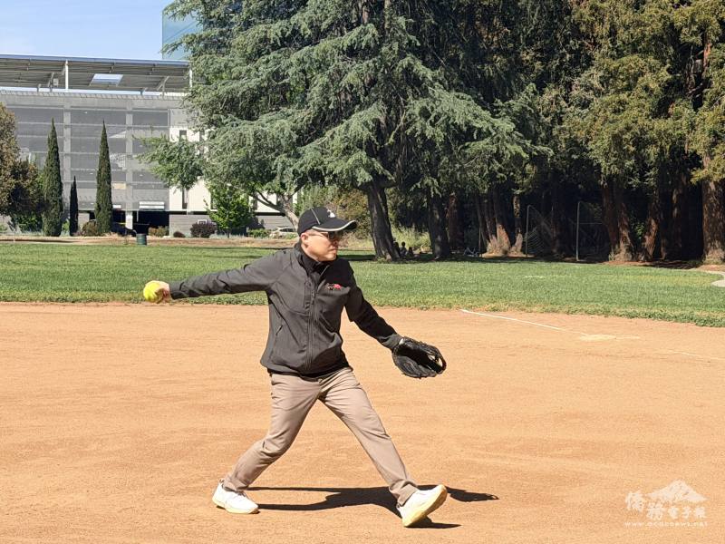 駐舊金山辦事處處長伍志翔開球。(由主辦單位海華棒壘球協會提供)