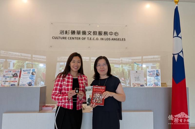 蒙特利公園市市長楊安立(左)拜會洛杉磯華僑文教中心,致贈個人著作,獲文教中心主任鍾佩珍(右)回贈「臺灣」胸針