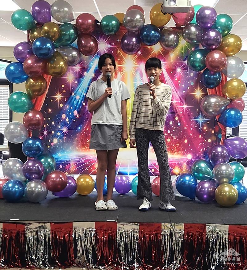六年級施柔衣和七年級張艾攸演唱〈外婆的澎湖灣〉,歌聲清麗。