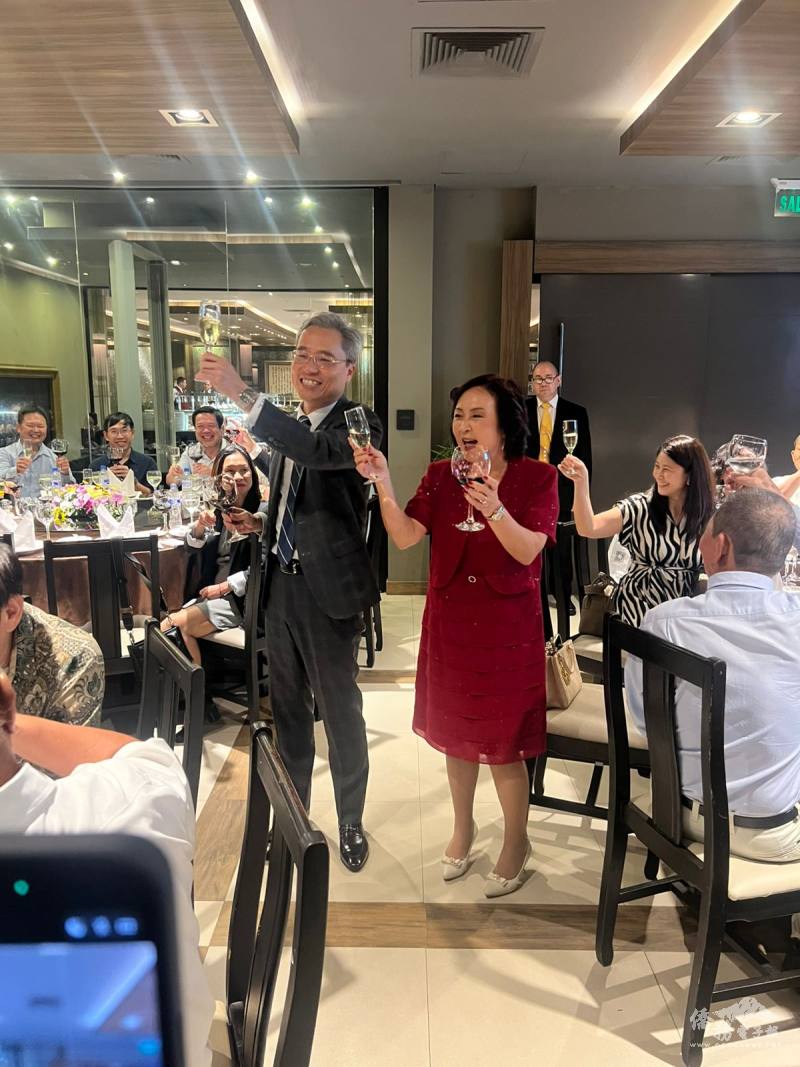 亞松森中華會館理事長暨僑務委員古美桂偕大使李岳融向出席晚宴貴賓敬酒歡迎