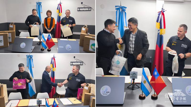 駐阿根廷代表處與第13A警局舉行設備捐贈儀式,雙方代表完成簽署並與捐贈設備合影,展現合作交流成果。
