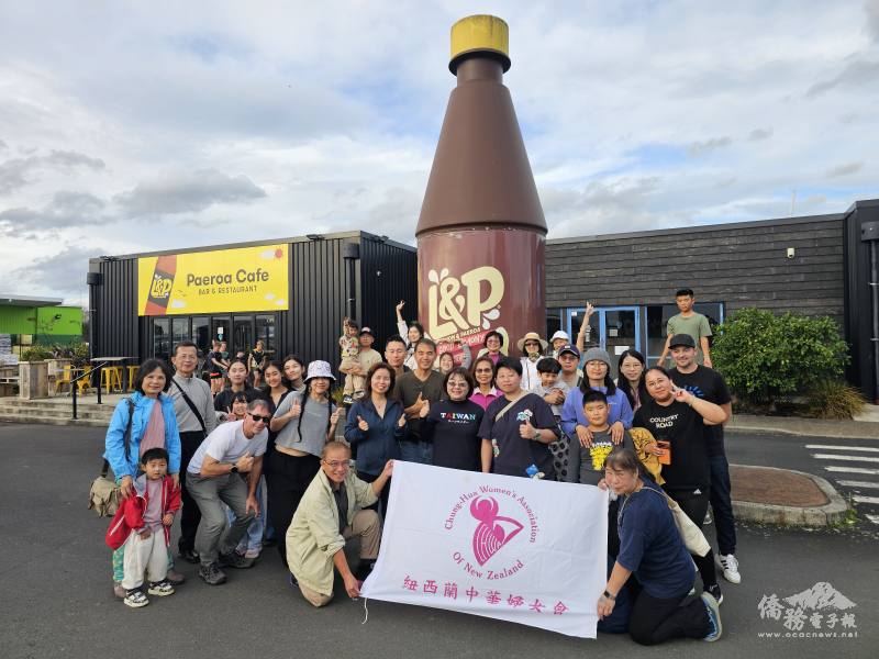 一行人與紐西蘭獨有L&P汽水瓶雕塑合影留念
