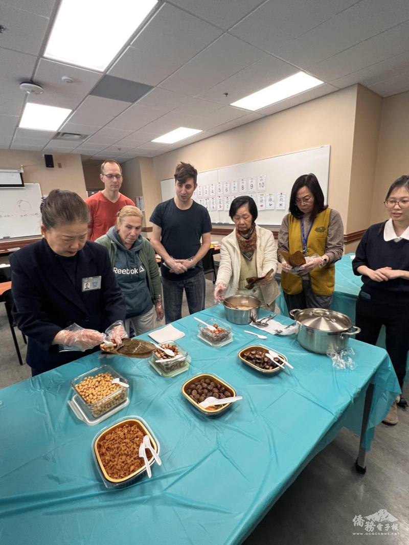 TCML學員對於包粽子活動充滿期待,老師符純篤表示,活動場地沒有廚房設備,她與志工團隊事先準備糯米、素肉、香菇、豆干、栗子、菜脯及鷹嘴豆等多樣食材,並於活動一早搬運至教室、分工擺設,展現高度的組織與合作精神。