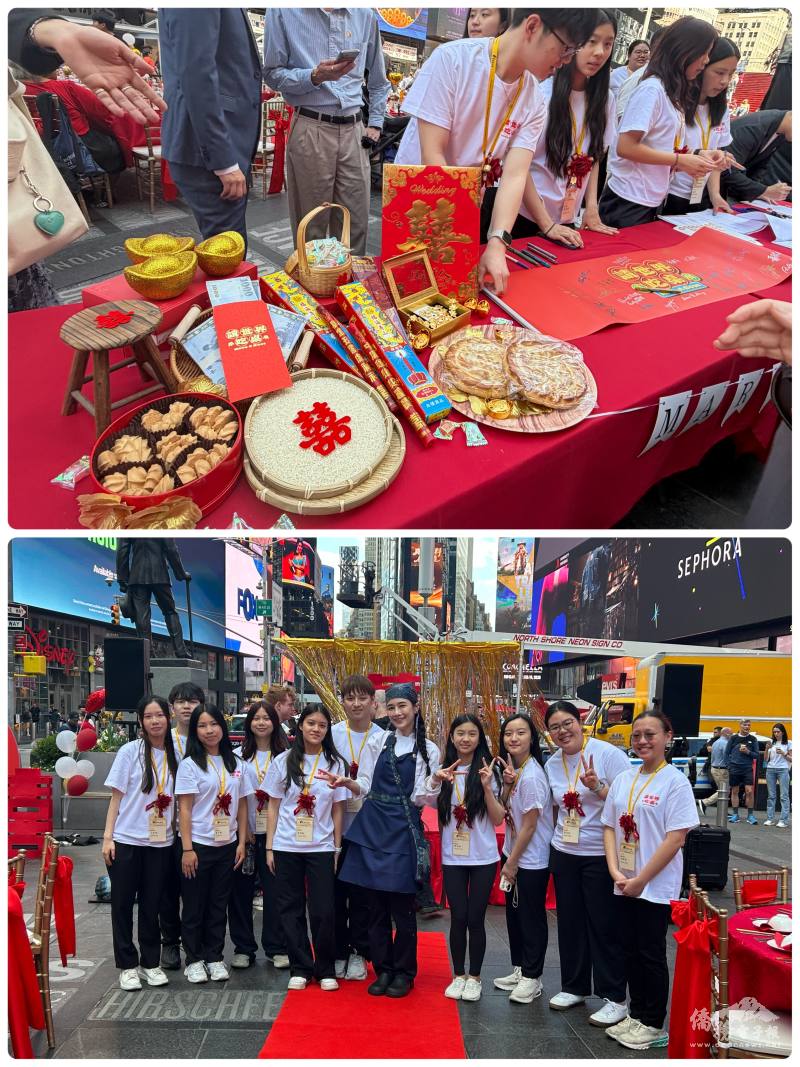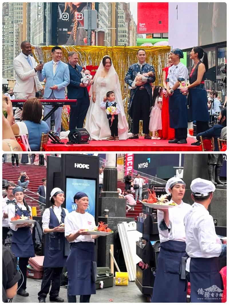 臺灣實境節目「請世界吃桌」4月17日於紐約時報廣場設宴,邀請3對新人與親友共同入席,透過富有臺灣特色的喜宴佳餚與熱鬧演出,向國際社會展現臺灣獨特的飲食文化與濃厚人情味。活動結合駐紐約辦事處與海外青年文化大使(FASCA)青年學員共同參與,讓臺灣文化不僅走進國際地標,也展現僑界青年投入文化外交的活力與行動力。