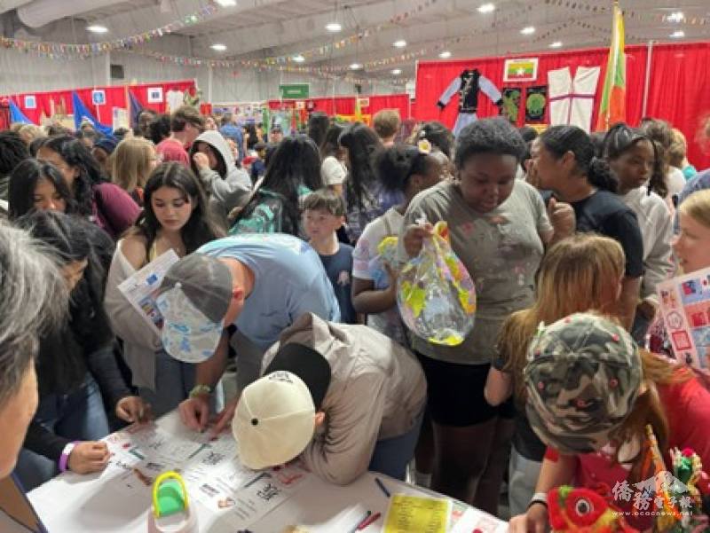 南卡國際節現場人潮湧現,臺灣攤位吸引大批學生參與體驗。 民眾親手練習正體字書寫,展現臺灣文化的魅力與互動學習的熱絡氛圍