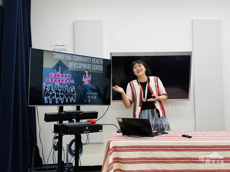 花蓮縣壽豐鄉部落健康營造中心代表Dungi Lunip說明,原住民族如何透過社區互助與陪伴支持,提升健康自覺,並將照顧力量延伸至整體社群