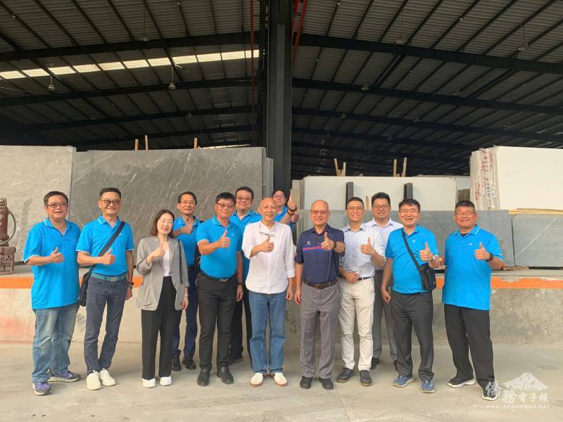 駐越南代表處公使林易民(右三)、越南臺灣商會聯合總會北寧分會會長林軒節(右2)、外貿協會駐河內辦事處主任施懿恬(左四)參訪北寧臺商會會員「聯利石材」