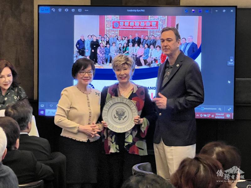 ILF國際領袖基金會創辦人董繼玲(左)頒獎給舊金山分會會長林美蓮(中)