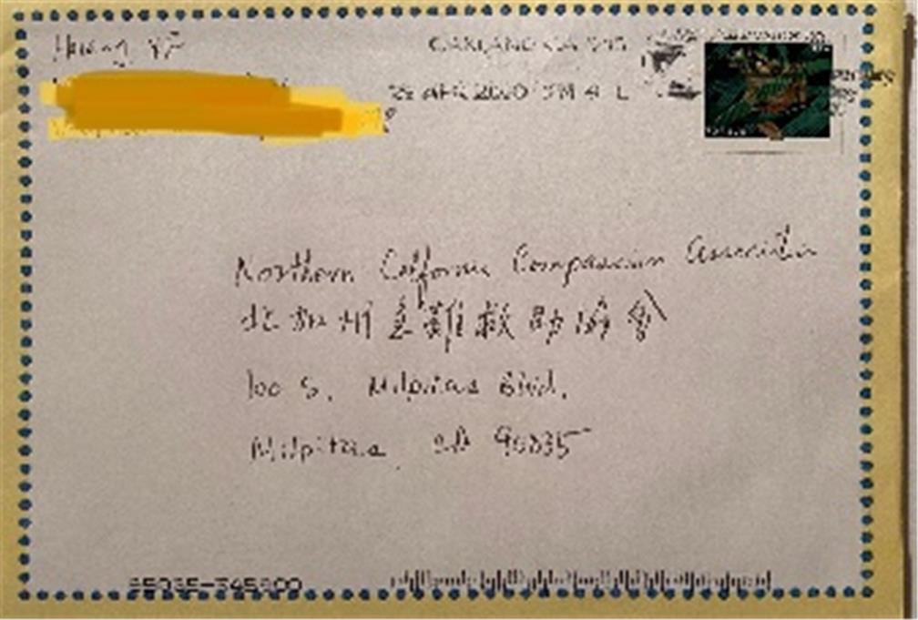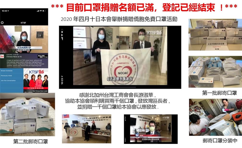 109年COVID-19(武漢肺炎)嚴重蔓延,北加州僑界急難救助協會-Cupertino中心輾轉購得2,000個口罩,4月10日以網上及電話報名再郵寄的方式,贈送給舊金山灣區60歲以上的長者,消息一經公布反應熱烈非凡,口罩兩個小時內全部申請完畢,工作人員在兩三天的時間內,將口罩全數寄出。因為供不應求,經北加州臺灣工商會會長游淑華支援再捐贈1,000個口罩,才得以成全網上登記長者的需求,另外也捐贈了200個口罩給美亞老人中心。