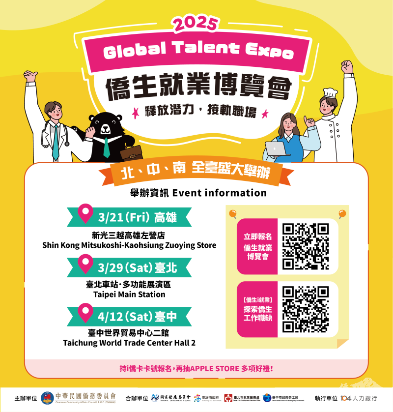 僑委會表示,根據觀察發現,國內企業提供僑生的職缺逐年增加,顯示臺灣企業對於僑生人才需求日殷。因此,僑委會將擴大辦理實體「僑生就業博覽會」,從去年臺北、高雄兩個場次,將擴大到臺中,2025年3月至4月間,將在北、中、南部各辦理一場,讓各地僑生就近與企業面對面交流、媒合職缺;南部將於3月21日(五)在新光三越高雄左營店10樓、北部將於3月29日(六)在臺北車站多功能展演區,中部將於4月12日(六)於臺中世貿中心2館舉行。
