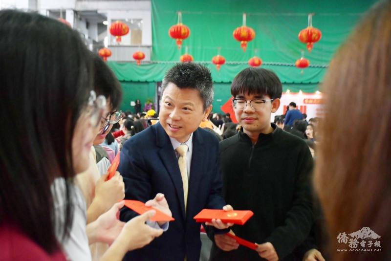 僑委會僑生處處長張文華,逐桌發紅包予僑生
