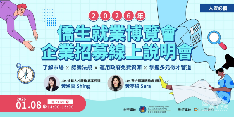 一零四人力銀行將於 2026 年 1 月 8 日(四)下午2時舉辦「僑生就業博覽會-企業招商線上說明會」,針對 2026 年年初預計正式施行的僑外生留臺就業新規定進行重點說明;並介紹實體媒合會和線上策展資訊,邀請有意願招募僑生且符合資格的企業共襄盛舉,歡迎有興趣參加線上說明會的企業填寫以下表單:https://104imc.vip/8g5cr8 。
