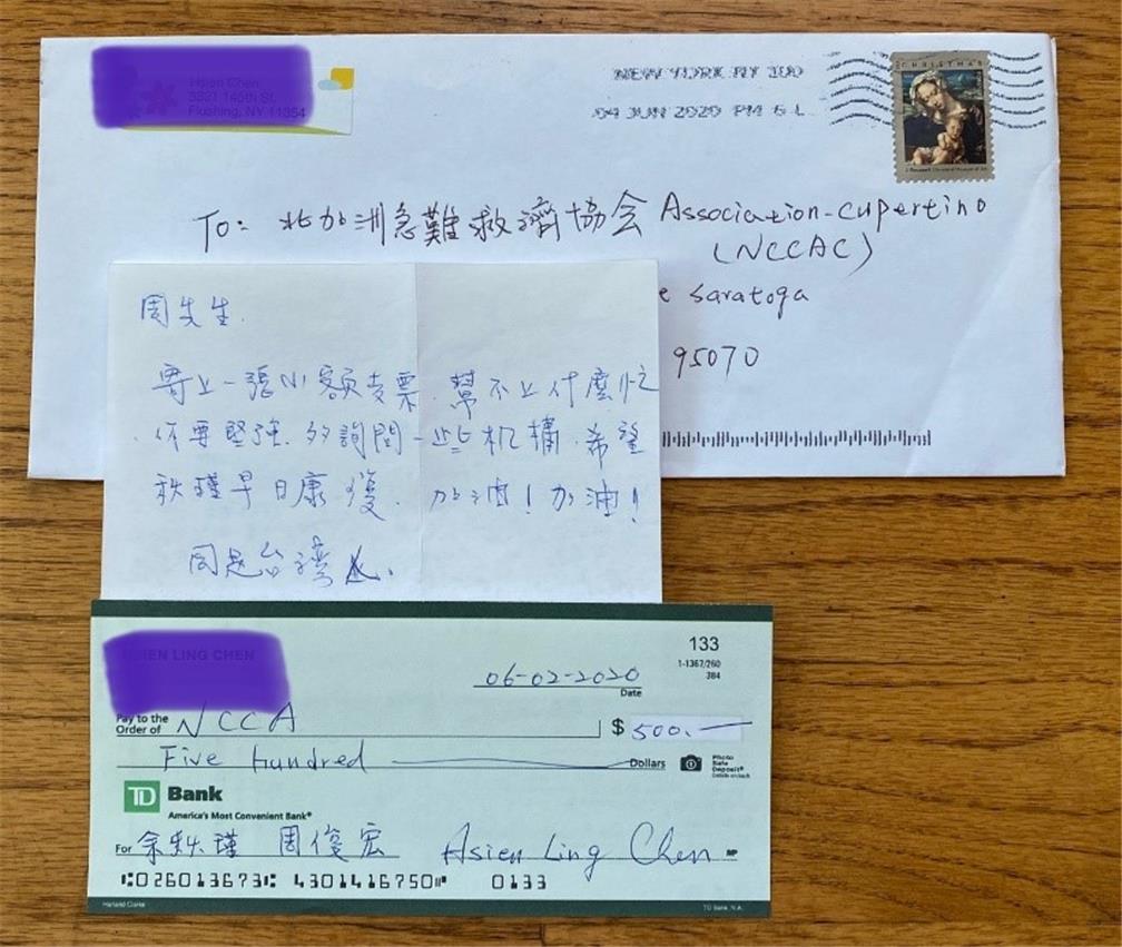 國人周俊宏先生及夫人余秋謹女士3月9日來美旅遊,5月余女士因癲癇發作跌倒,頭部碰撞硬物導致昏迷,送至Regional Hospital 急診室,因為腦部出血轉至ICU,時值新冠疫情嚴重之際,醫院堅決謝絕探訪,包括親屬家眷,周先生著急不已加上語言不通、制度不一樣,正當手足無措時,北加州急難救助協會 - Cupertino中心得知後,馬上透過會長馬蒨君母親在 Regional Hospital 的主治醫師王醫師,幫忙與余女士主治醫師及護理長溝通,始獲允許家屬一周一次探望。之後余女士腦中血塊漸小,病情穩定轉往普通病房,余女士醒來後,因其左半身中風,講話也不很清楚,王醫師以中文與其溝通,在異鄉的余女士頓時感到無限溫馨與放心。兩個月的醫療費用高達美金兩百萬元以上,與院方溝通協調後降至美金二十萬元,面對如此龐大的醫療費用,周先生打算回臺東變賣所有資產來償還,臨走之前先向親友借了美金兩萬元支付部分醫藥費才順利於6月10日返臺,此期間協會也借助媒體與社交網路力量,積極為周先生募款,直接寄還給醫院。
