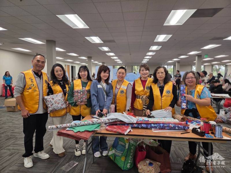 橙縣華人獅子會12月13日加入非營利組織Miracles for Kid為癌症兒童包裝禮物的歲末志工服務。圖左1前會長洪陳鋒、左4橙僑中心主任蕭蓓如、右4會長楊怡文、右3秘書長鄭麗雅。