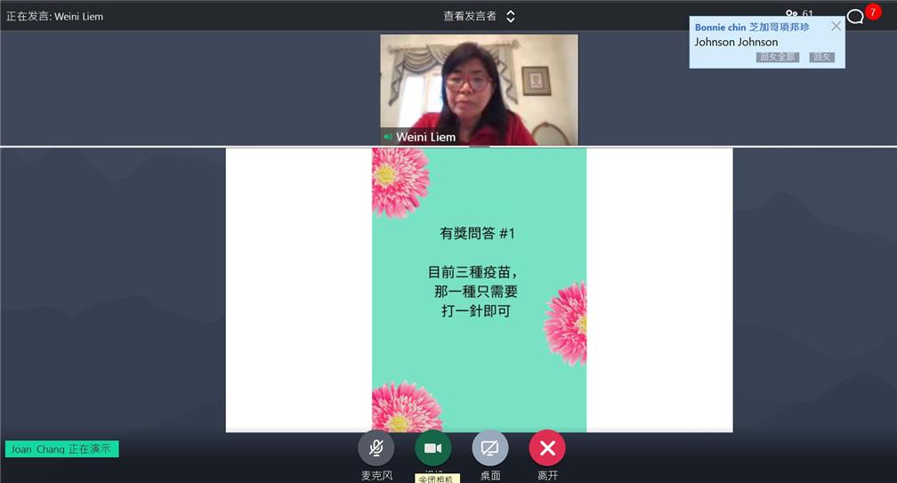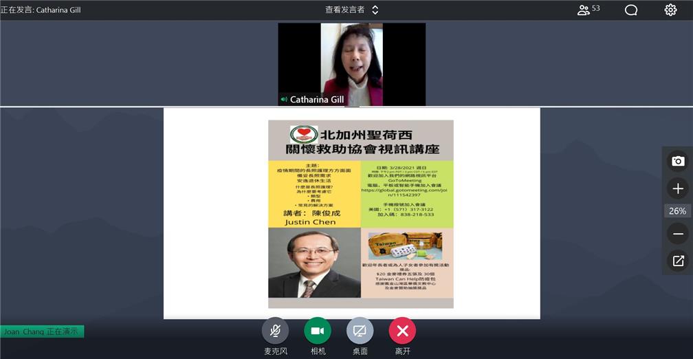 北加州聖荷西臺灣海外僑界急難救助協會110年3月28日下午舉辦「疫情期間長照護理方方面面」視訊講座,會長李漢文僑務委員先說明本地政府目前防疫規定,並由副會長陳俊成及韓中芬分別主講長期照顧長者所面臨理財、醫療保險可能問題及相關資源等內容,會員與僑胞鄉親共約60人參與,金山灣區僑教中心閻樹榮主任應邀參加,講座最後有獎徵答致贈僑委會提供之防疫關懷包30個。
