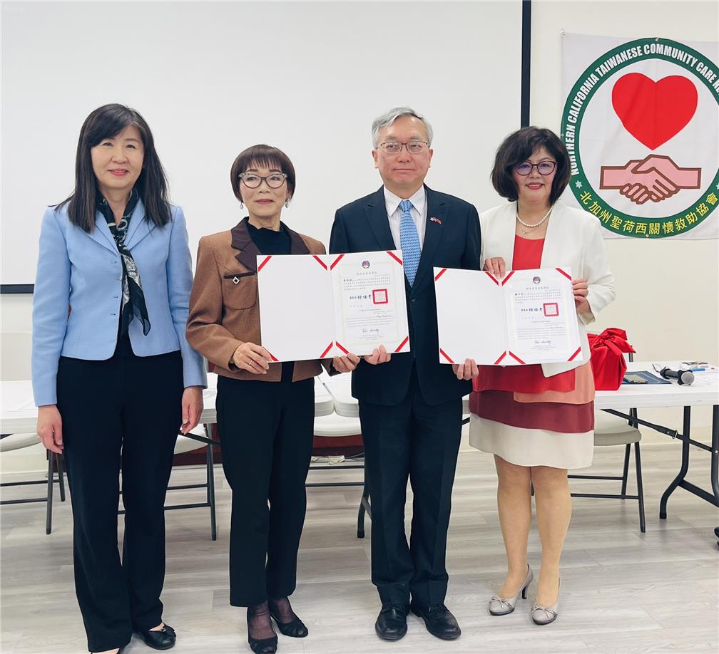 北加州聖荷西臺灣海外僑界急難救助協會4月6日在中心舉辦第三及第四屆會長及幹部交接典禮,由駐處朱副處長永昌監交,並與中心莊主任雅淑代表鈞會委員長頒發賀狀予新任會長李萍萍及感謝狀予卸任會長韓中芬,創會會長李漢文僑務委員擔任主持人。朱副處長感謝韓會長帶領團隊幫助國人留學生度過難關,期許新團隊在未來繼續當政府的後盾。僑委會號召海外僑社成立急難救助協會初衷是在海外建立安全網,凝聚僑界力量來協助有需要國人或僑胞。