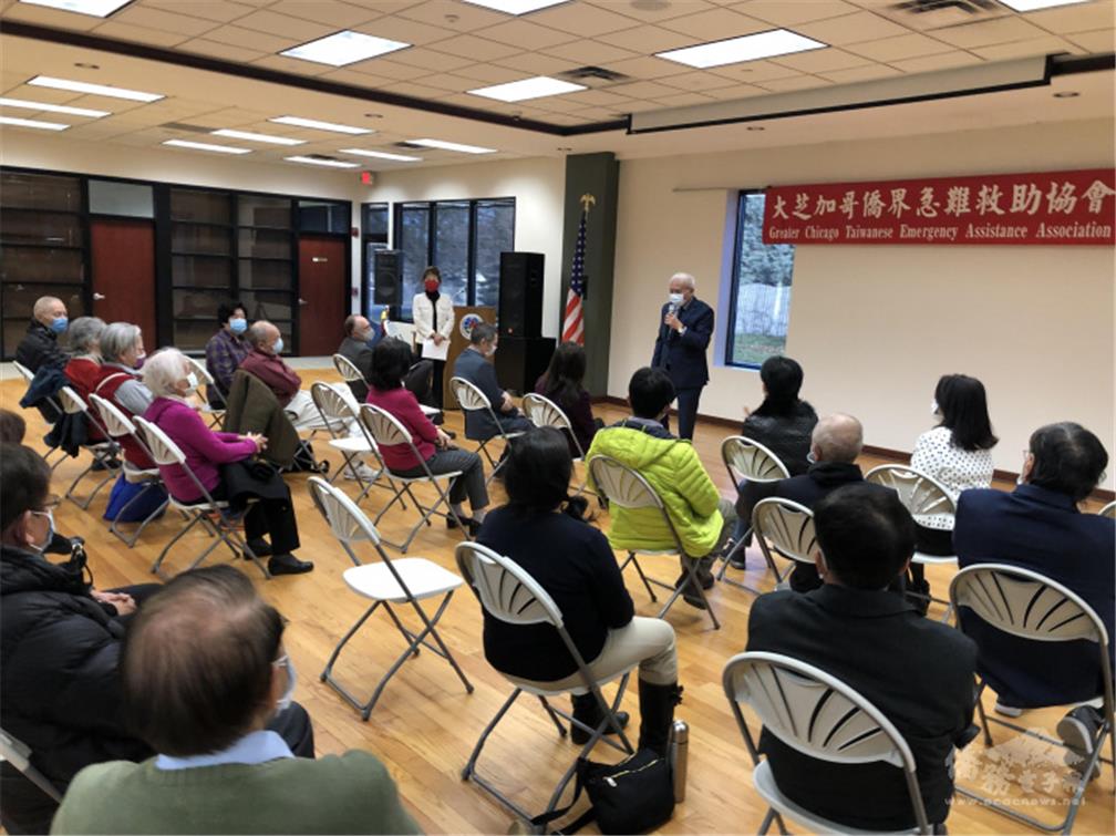 陳明芳首先致詞說明大芝加哥僑界急難救助協會成立宗旨在協助海外國人處理急難事件,該協會成立3年來,感謝各位理事及志工們的熱心付出,以及僑界的支持與肯定。劉綏珍致詞感謝陳會長邀請2位專家講授醫療保險及養生樂活,在後疫情時代,擁有規劃周全的醫療保險才能無後顧之憂,好好經營自己的健康,享受均衡快樂的生活。劉綏珍並向大家說明,僑委會與衛福部共同推出的健康益友APP已自今年底延至明年6月30日前,免費提供海外僑胞與林口長庚等四大醫學中心專科醫師面對面的線上健康諮詢服務,歡迎僑胞申請僑胞卡踴躍下載應用。蔡振發致詞表示,很榮幸代表駐處應邀出席這場活動,今天講題包括保險及養生,對外有保險的安全保障,對內有健康的身體,才能打拼自己的事業,並營造充實的人生。