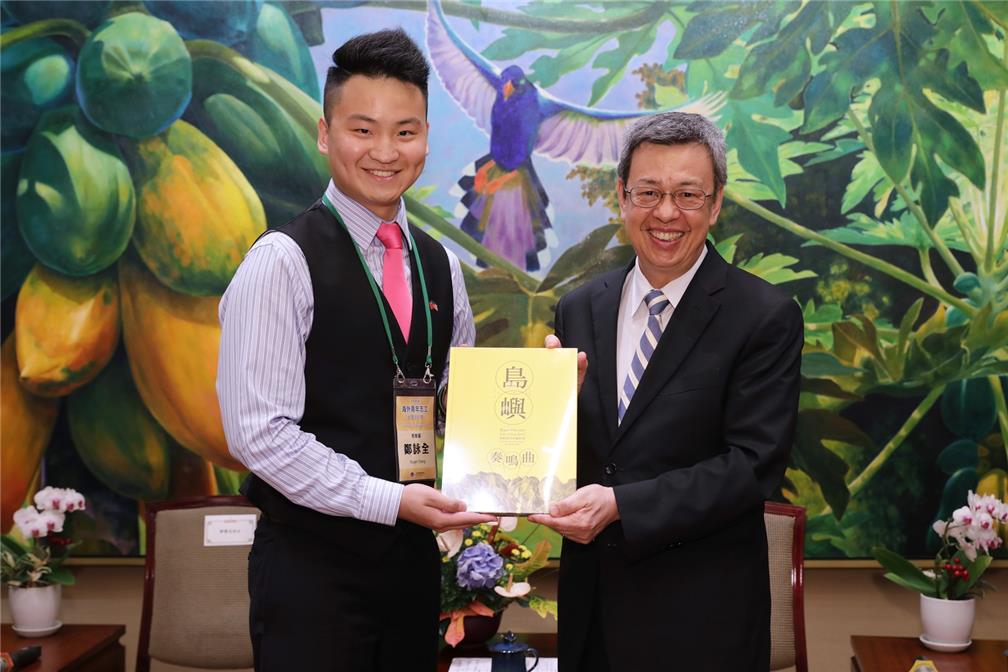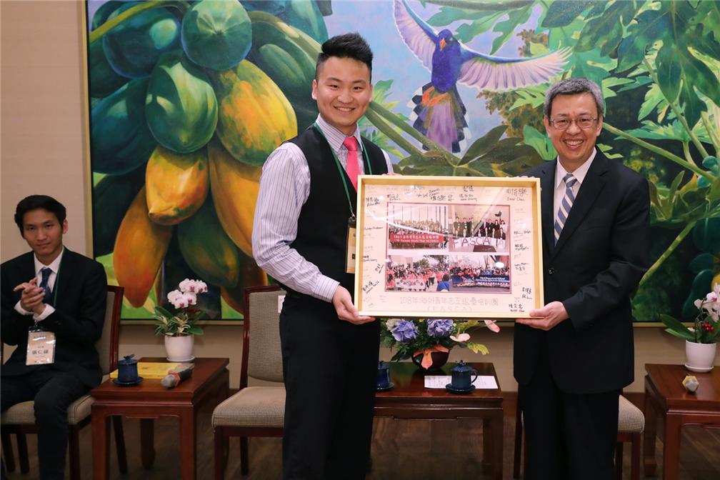 陳副總統致贈108年海外青年志工(FASCA)返臺培訓團全體學員紀念品,由學員長鄭 詠全代表受贈並合影。