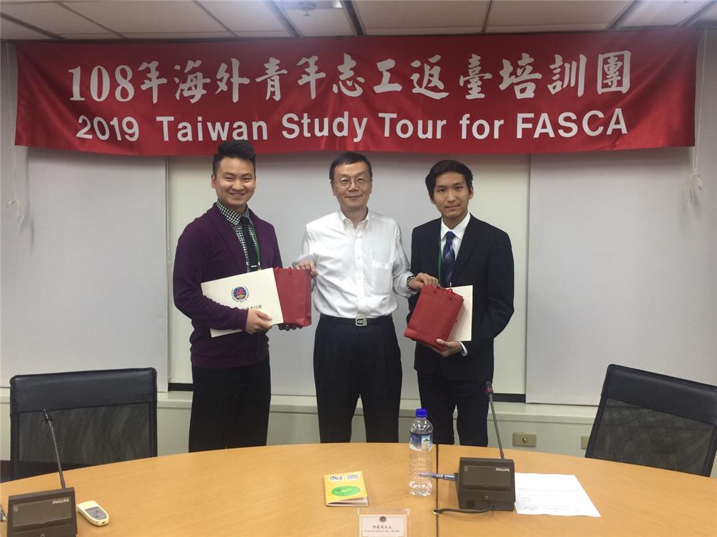 呂副委員長致贈108年海外青年志工(FASCA)返臺培訓團全體學員紀念品,由學員長鄭詠全代表受贈並合影。