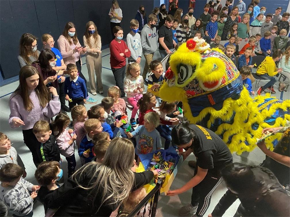 密西根州青年舞獅隊於學童間舞獅並分送紙鶴,為在戰火中的烏克蘭人民祈福。