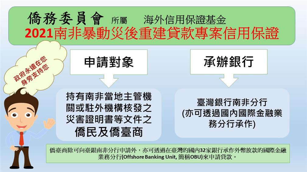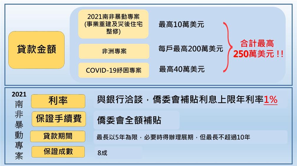 110年7月南非地區發生暴動事件,僑委會為落實政府照顧海外僑臺商政策,第一時間即責請海外信用保證基金啟動辦理「2021 南非暴動專案」,提供受災僑臺商災後住宅整修或經營事業之重建貸款,最高10萬美元,保證成數最高8成,並由僑委會補貼利息上限年利率1%及保證手續費全額,連同該基金持續辦理之「非洲專案融資保證」,每戶最高200萬美元,以及「新冠肺炎紓困方案4.0」貸款申請上限40萬美元,3項專案合計貸款額度最高達250萬美元,積極協助有資金融通需求之僑臺商,延續事業永續發展。