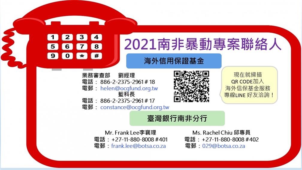受南非暴動影響之僑臺商如有貸款需求,可聯絡臺灣銀行南非分行Mr. Frank Lee李襄理(電話:+27-11-880-8008 #401;電郵:frank.lee@botsa.co.za)及Ms. Rachel Chiu 邱專員(電話:+27-11-880-8008 #402;電郵:029@botsa.co.za),或洽海外信用保證基金服務窗口劉經理(+886-2-23752961轉18),也歡迎加入該基金LINE專線好友進行線上諮詢(ID:@Taiwan-Fund)。