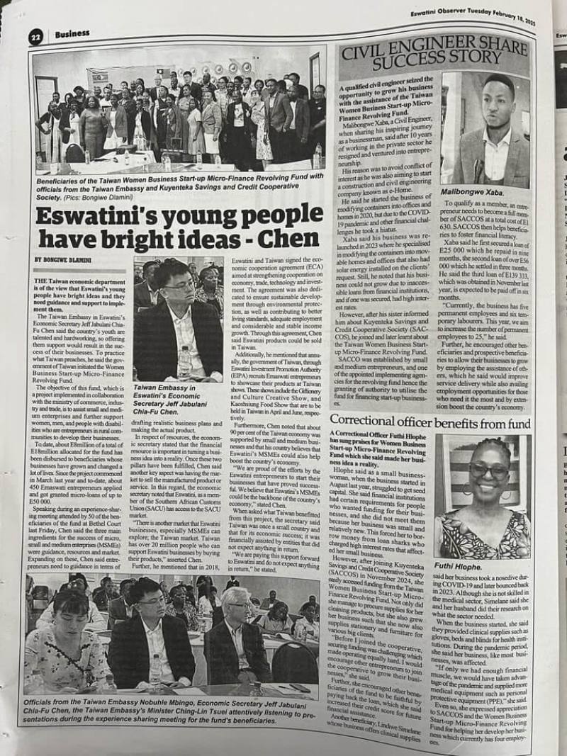 國合會在史國舉辦「婦女創業成功案例分享會」,「史瓦帝尼觀察家日報」(Eswatini Observer)於2月18日大篇幅報導。(國合會提供)