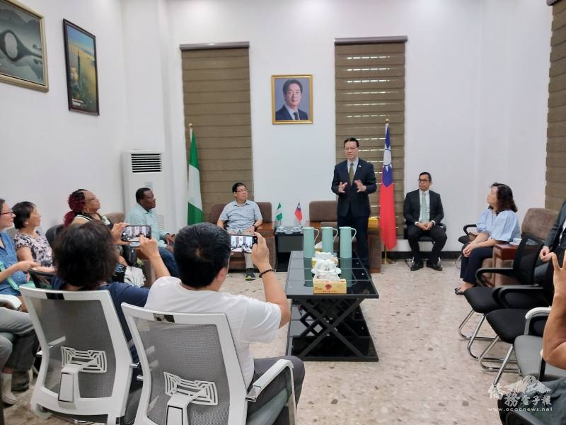 劉翼平(立者)誠摯歡迎北美洲臺灣人醫師協會義診團拜會駐駐奈代表處,簡介代表處自設立至被迫遷都至拉哥斯歷程,讓義診團更瞭解我政府於奈國的外交處境