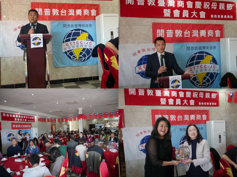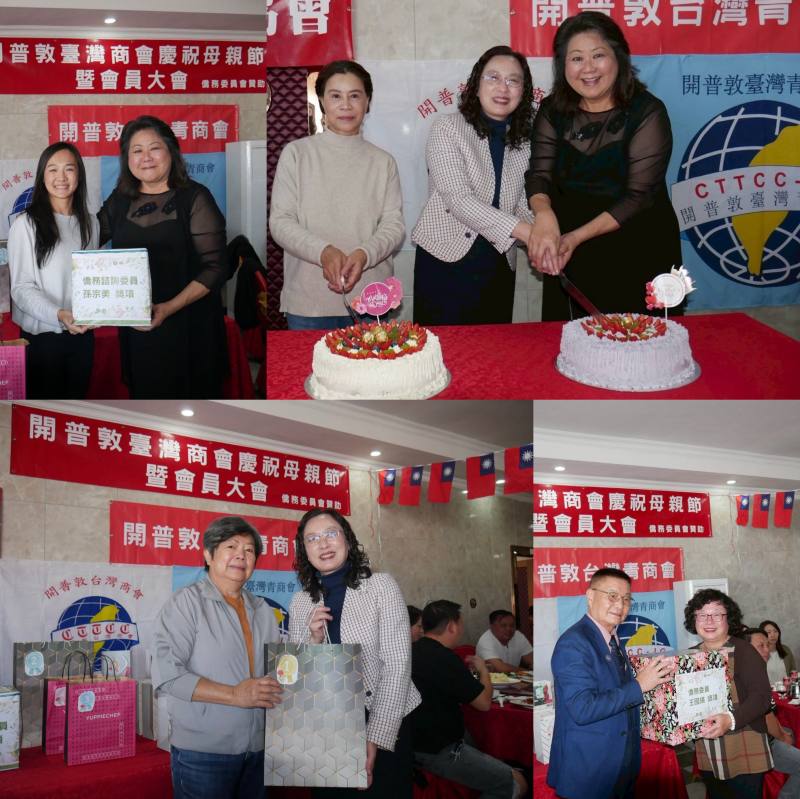 開普敦臺灣商會及青商會於5月4日共同舉辦年度會員大會,並邀請僑民及當地社區民眾提前歡慶母親節。駐開普敦辦事處處長陳瑩莉與夫婿及僑務秘書李綺霞應邀參加;陳瑩莉特別致贈母親節蛋糕及摸彩品助興,逾百位僑胞參與。