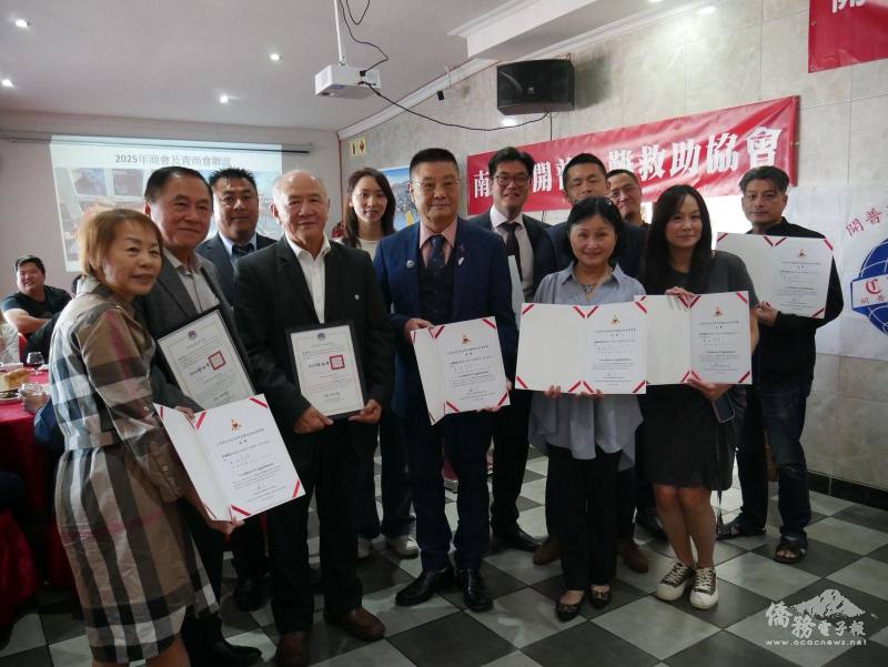 大開普敦地區僑界急難救助協會日前完成會長改選, 於5月4日舉辦新滿任會長交接儀式,由滿任會長林錦華交接給新任會長李浩芳,並邀請駐開普敦辦事處處長陳瑩莉及僑務秘書李綺霞、僑民及當地社區民眾近百人共同見證。