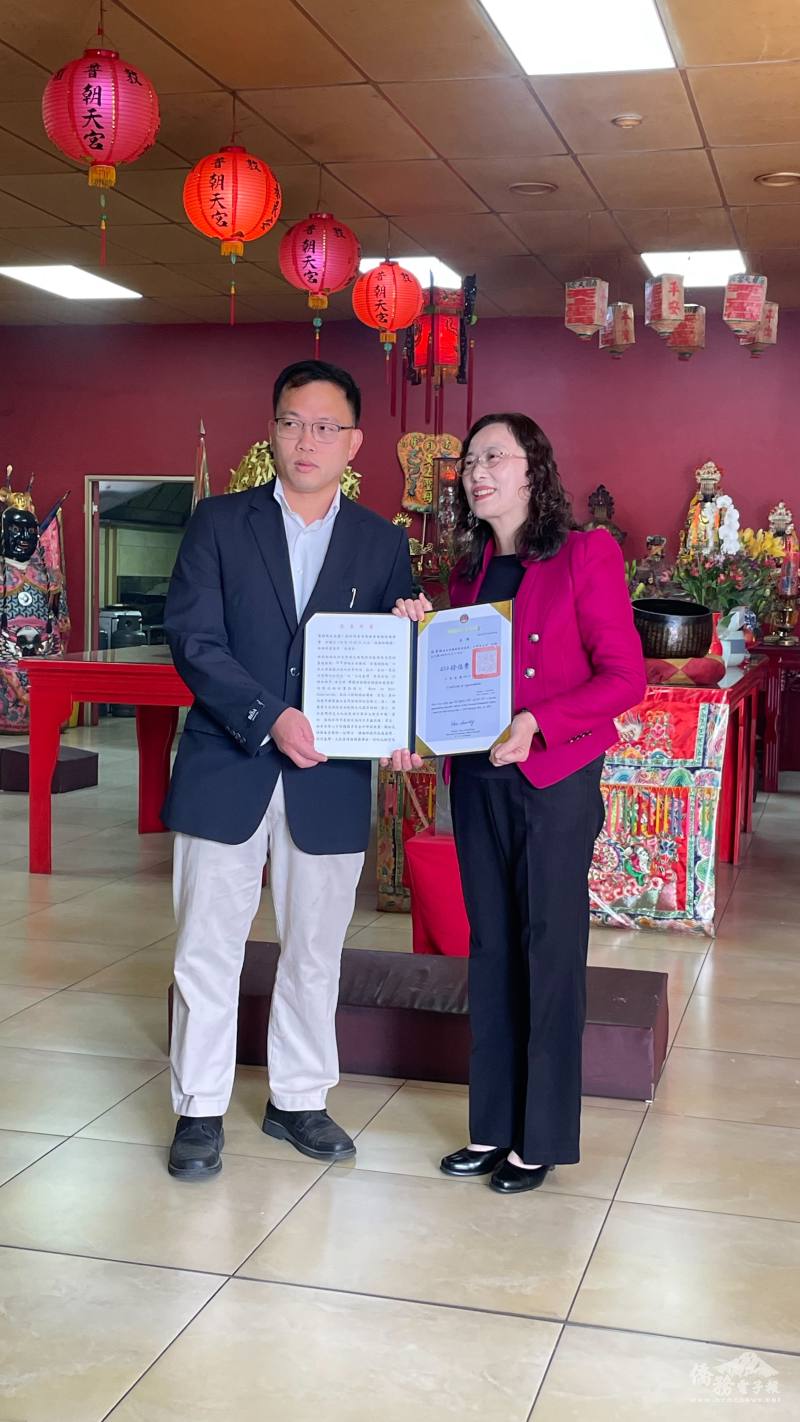 陳瑩莉代表僑務委員會委員長徐佳青頒贈感謝狀給張信城