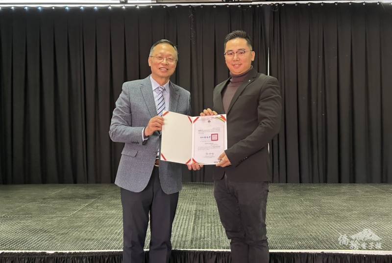 廖文哲(左)代表僑委會頒發舉辦國慶活動感謝狀予魏鼎洋(右)