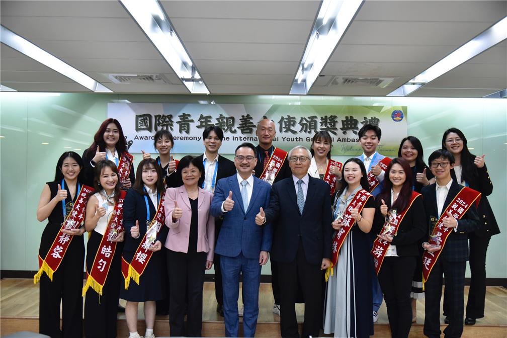 2024年11月19日僑務委員會副委員長阮昭雄偕同主任秘書張良民及僑民處處長賴麗瑩於「國際青年親善大使」頒獎典禮中頒發親善大使獎牌,並與其中返臺的11位得主及2022年親善大使得主合影。