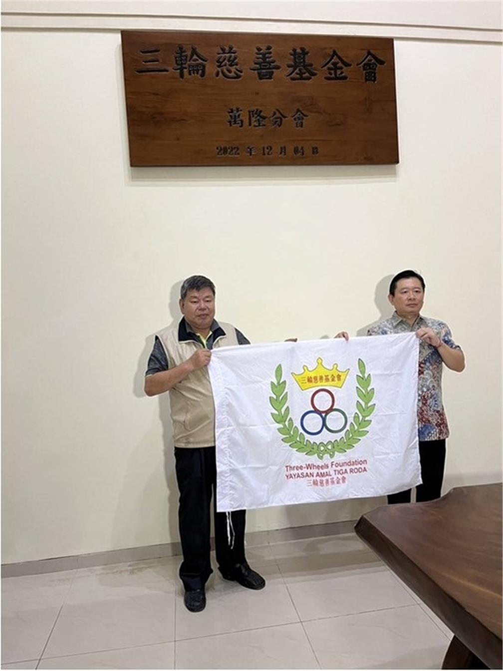 萬隆三輪慈善基金會揭牌儀式,時任執行長鍾文燐授旗給萬隆執行長柯百觀。