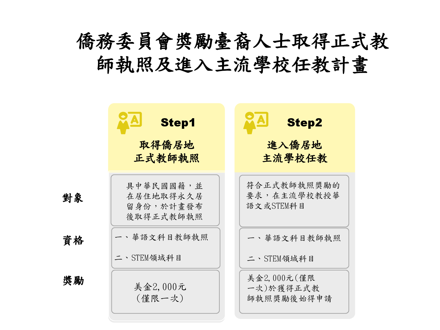 獎勵對象為具中華民國國籍,且已取得僑居地永久居留身分,並於本計畫發布後取得僑居地任教華語文,或科學(Science)、科技(Technology)、工程(Engineering)及數學(Mathematics)四大領域(以下簡稱STEM)其中任一領域之正式教師執照及進入僑居地主流學校任教相關科目者。